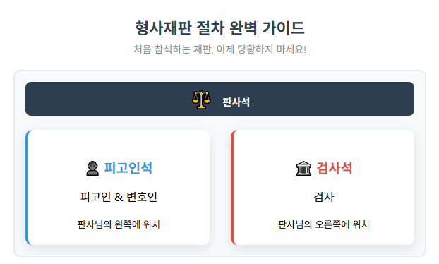 저도 예전에 지인의 형사재판에 방청인으로 참석한 적이 있었는데, 그때 미리 구조를 알았더라면 훨씬 덜 당황했을 것 같았습니다.