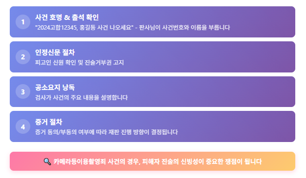 재판이 시작되면 판사님은 먼저 피고인의 신원과 공소장에 기재된 이름 등이 일치하는지 확인합니다. 이것이 바로 인정신문이라는 절차입니다. 이어서 피고인에게 진술거부권을 알려주며, 불리한 진술을 하지 않아도 된다는 점을 설명합니다.