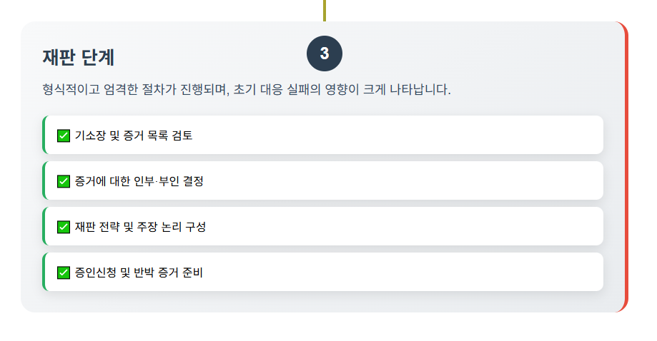 재판 단계에 들어서면 사건은 훨씬 더 형식적이고 엄격한 절차를 따르게 됩니다. 이 시점에서 변호사를 선임하는 경우가 많지만, 사실상 늦은 감이 있습니다.