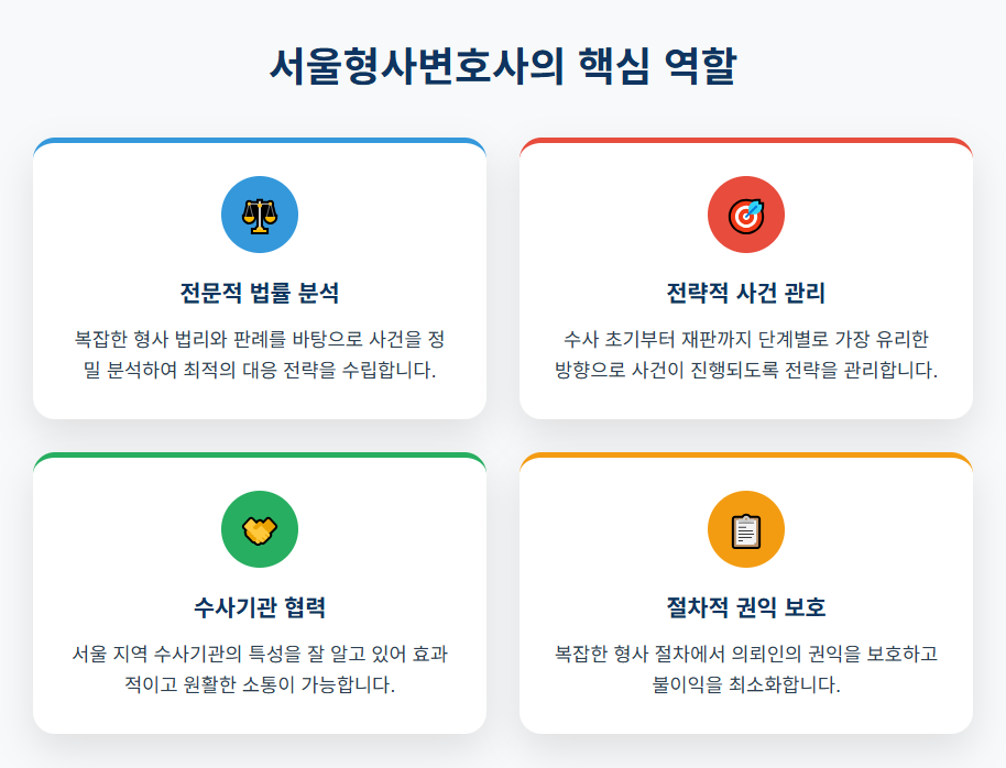 서울형사변호사는 이런 상황에서 전략적 대응 방안을 수립하고, 의뢰인에게 가장 유리한 방향으로 수사가 진행될 수 있도록 돕습니다.