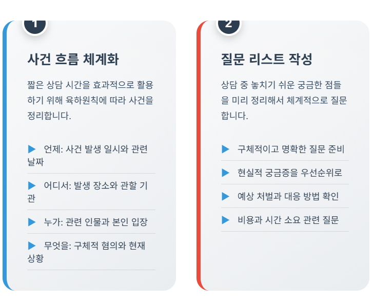 갑작스럽게 형사사건에 연루되면 가장 먼저 드는 생각이 **"변호사와 상담을 받아야겠다"**는 것입니다. 하지만 막상 상담을 받으러 가면 시간은 짧고, 할 말은 많고, 정작 중요한 것들은 빠뜨리게 되는 경우가 많습니다.