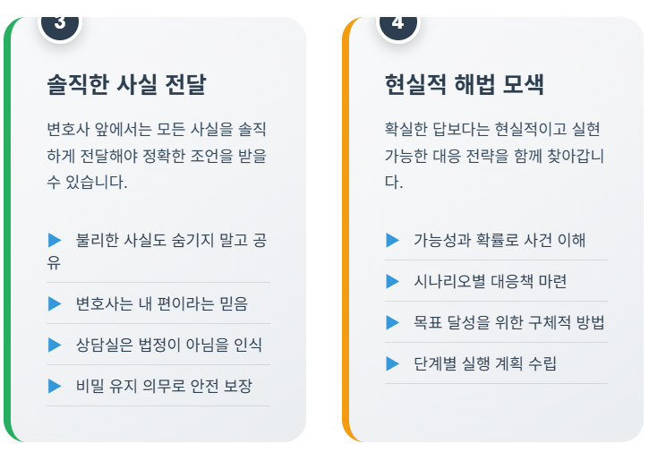 형사상담 과정에서 가장 중요한 것 중 하나가 솔직한 사실 전달입니다. 일부 불리한 사실을 숨기거나 좋게 포장해서 말씀하시는 분들이 있는데, 이는 오히려 역효과를 낳을 수 있습니다.