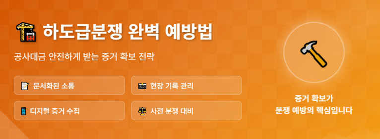 현장 사진과 시공 과정 기록은 하도급 분쟁 시 가장 강력한 증거가 됩니다.